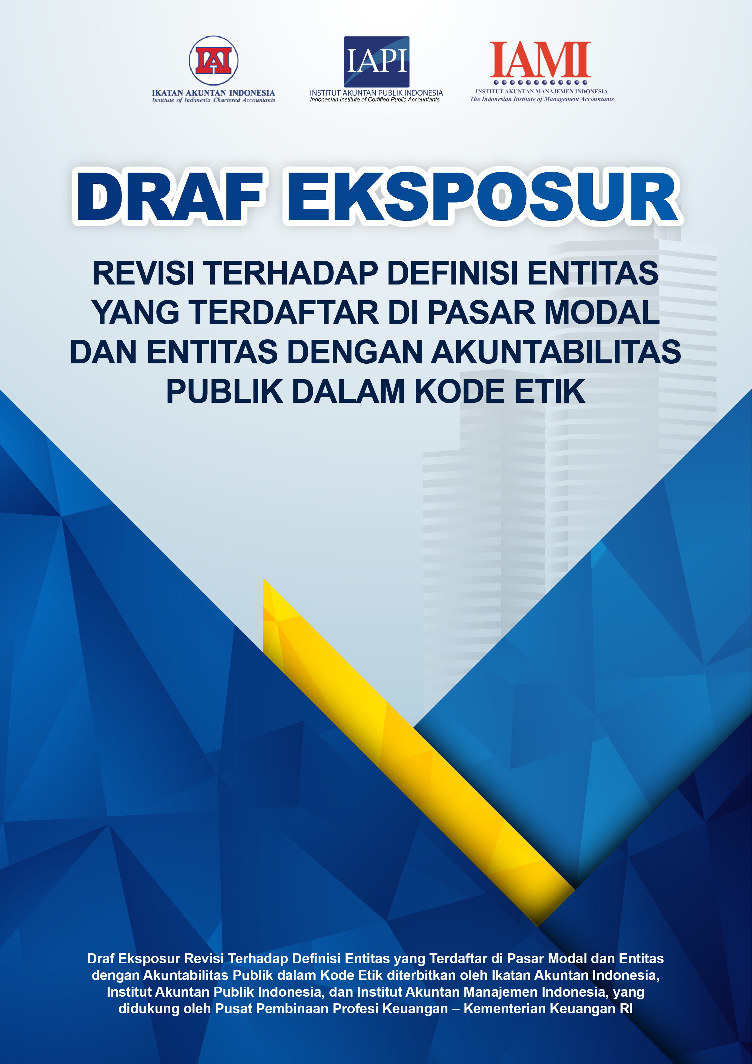 Komite Etika Profesi Institut Akuntan Publik Indonesia (IAPI), Dewan Kode Etik Ikatan Akuntan Indonesia (IAI), dan Komite Etika Institut Akuntan Manajemen Indonesia (IAMI) telah menyetujui Draf Eksposur (DE) atas Revisi Terhadap Definisi Entitas yang Terdaftar di Pasar Modal dan Entitas dengan Akuntabilitas Publik dalam Kode Etik pada tanggal 17 September 2024. DE ini diterbitkan untuk disebarluaskan dan ditanggapi oleh Akuntan Publik, Anggota IAPI, Anggota IAI, Anggota IAMI, Akademisi, Regulator, dan pihak lainnya.