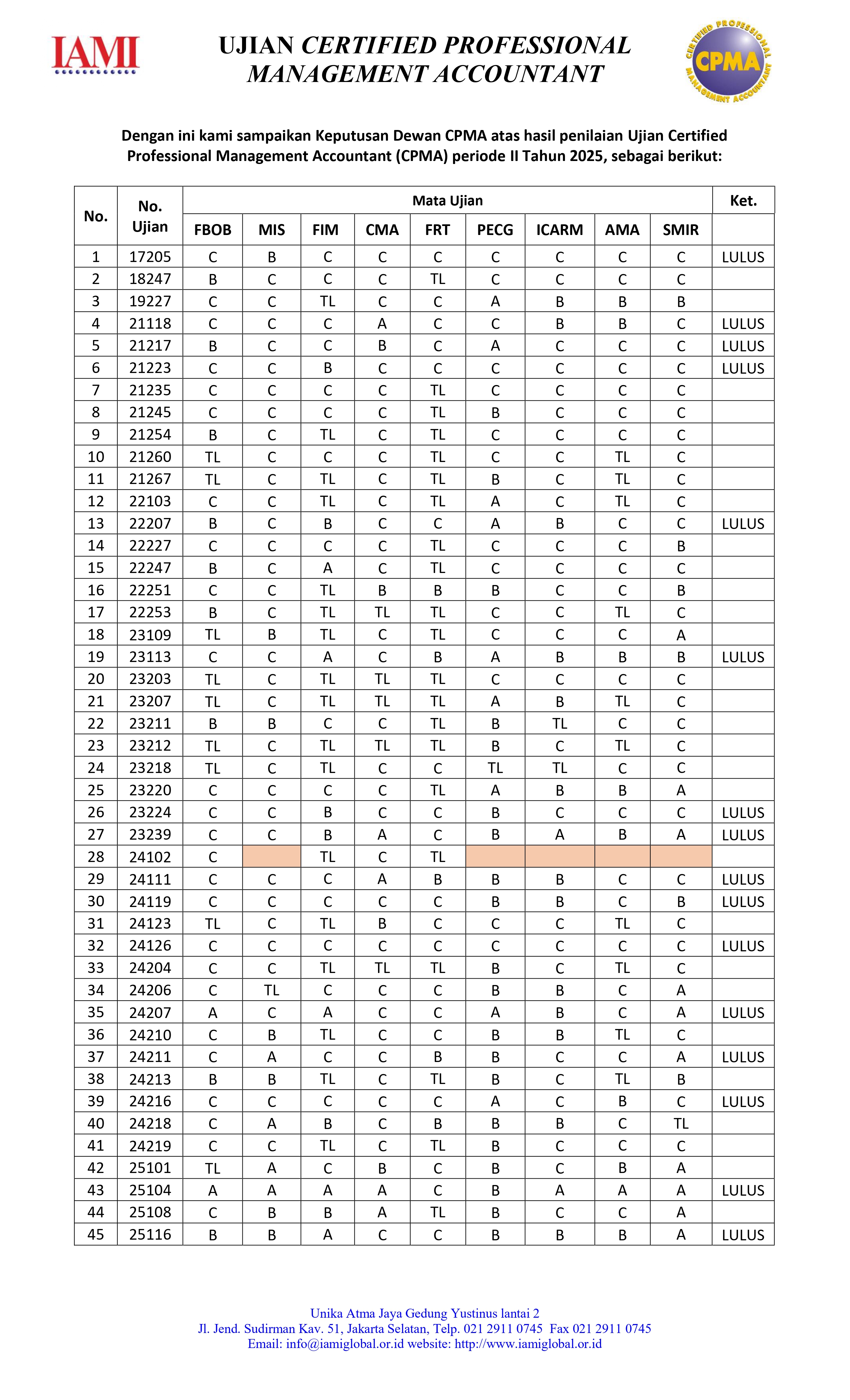 Bersama ini kami sampaikan Keputusan Dewan CPMA atas hasil penilaian Ujian Certified Professional Management Accountant (CPMA) periode November Tahun 2025.