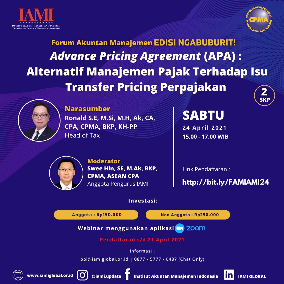 Institut Akuntan Manajemen menyelenggarakan Forum Akuntan Manajemen [EDISI NGABUBURIT] dengan tema : "Advance Pricing Agreement (APA) : Alternatif Manajemen Pajak Terhadap Isu Transfer Pricing Perpajakan"