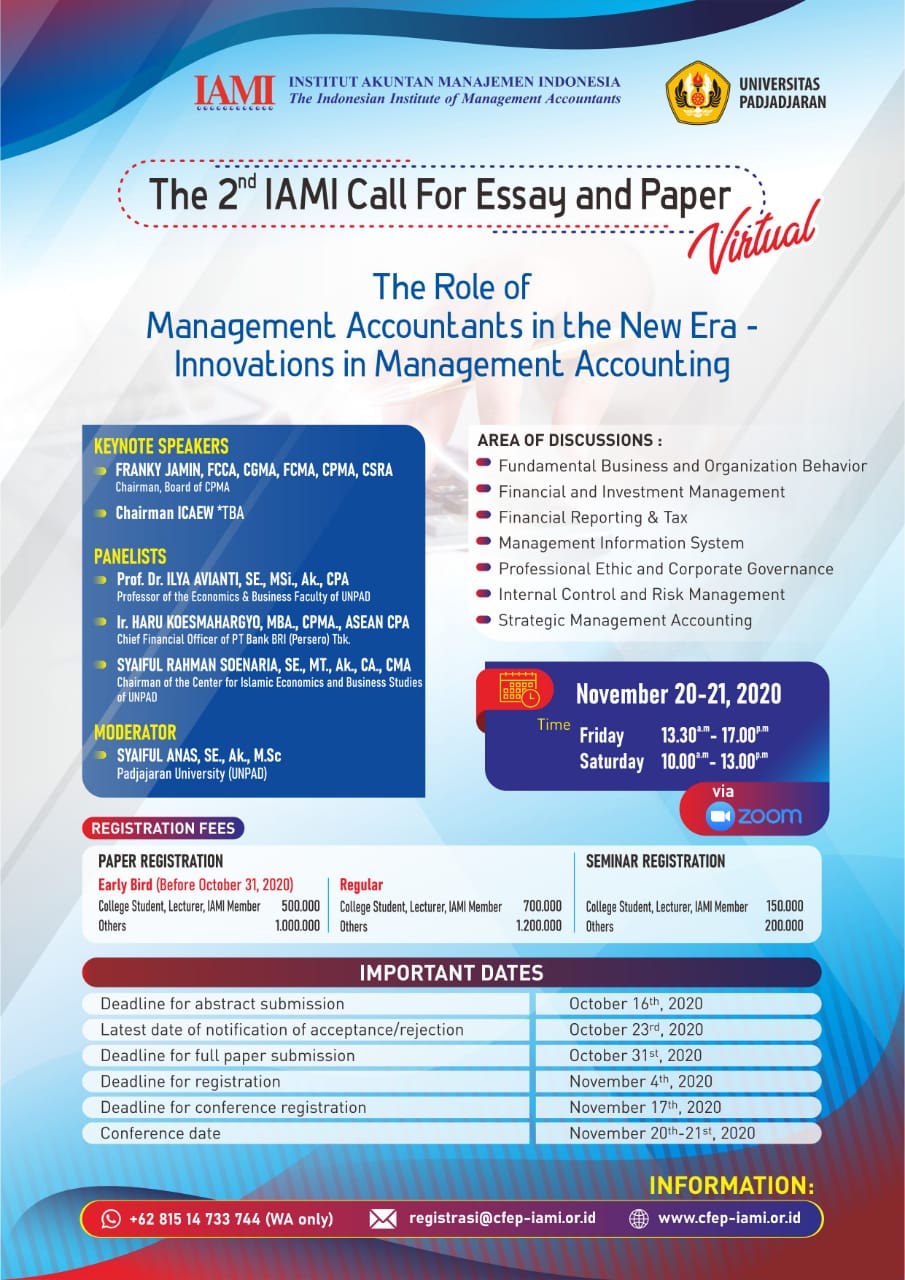 The 2nd IAMI Call for Essay and Paper kali ini bekerjasama dengan Fakultas Ekonomi dan Bisnis Universitas Padjadjaran - Bandung mengusung tema : "The Role of Management Accountants in the New Era - Innovations in Management Accounting"